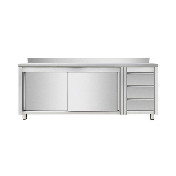 Work cabinet with sliding doors and drawer unit on the right, with upstand, 1600 x 700