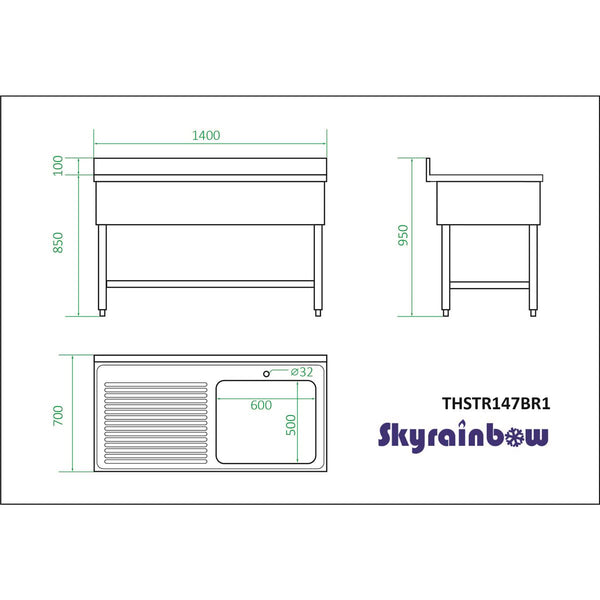 Stainless steel sink unit, one bowl right, 140 x 70
